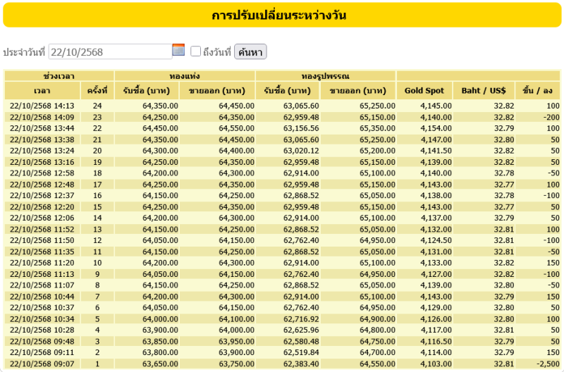 สำหรับราคาทองคำเปิดตลาดประจำวันที่ 22 ตุลาคม 2568 เปิดตลาดปรับลง 2,500 บาท ในครั้งที่1 ต่อมามีการปรับขึ้น-ลง รวมแล้ว 24 ครั้ง โดยทองรูปพรรณขายออกบาทละ 65,250 ตามข้อมูลจากเว็บไซต์ของ สมาคมค้าทองคำ เมื่อเวลา 14.13 น.