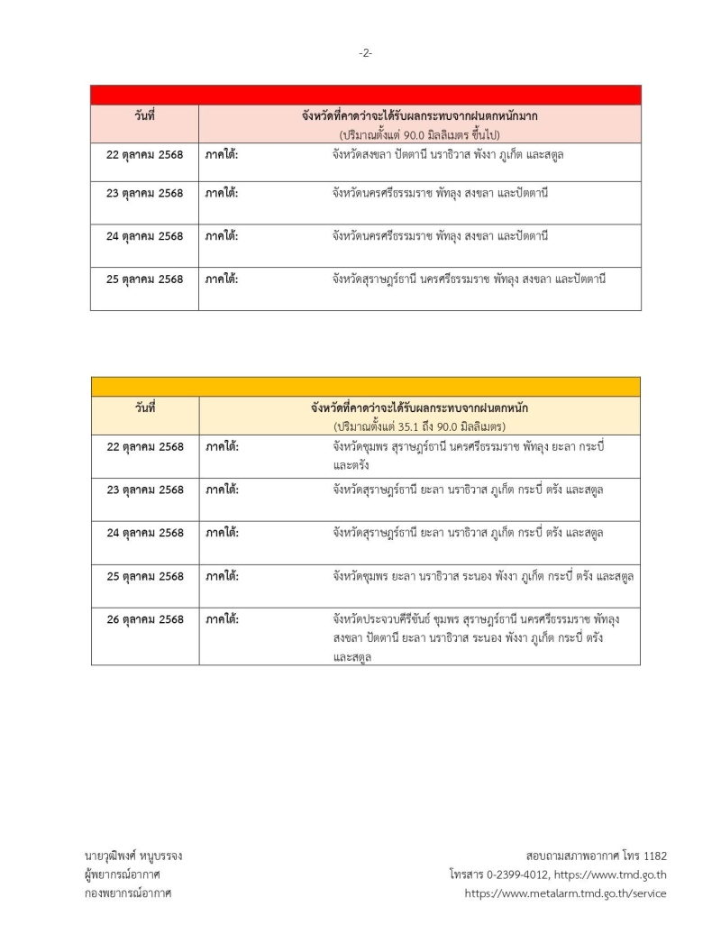 สำหรับภาคใต้มีฝนตกหนักถึงหนักมากบางแห่งในช่วงวันที่ 22-26 ต.ค. 68 เนื่องจากร่องมรสุมกำลังปานกลางพาดผ่านภาคใต้ตอนกลาง ประกอบกับลมตะวันออกเฉียงเหนือพัดปกคลุมอ่าวไทยและภาคใต้ ขอให้ประชาชนในบริเวณดังกล่าวระวังอันตรายจากฝนตกหนักถึงหนักมาก ซึ่งอาจทำให้เกิดน้ำท่วมฉับพลัน น้ำป่าไหลหลาก และน้ำล้นตลิ่ง