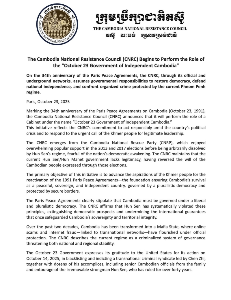 23 ต.ค. 2568 สม รังสี อดีตผู้นำฝ่ายค้านกัมพูชา และสภาต่อต้านแห่งชาติกัมพูชา (CNRC) ออกแถลงการณ์ประกาศจัดตั้ง รัฐบาลกัมพูชาอิสระ (Government of Independent Cambodia) อย่างเป็นทางการ เพื่อฟื้นฟูประชาธิปไตยและเอกราชของชาติ