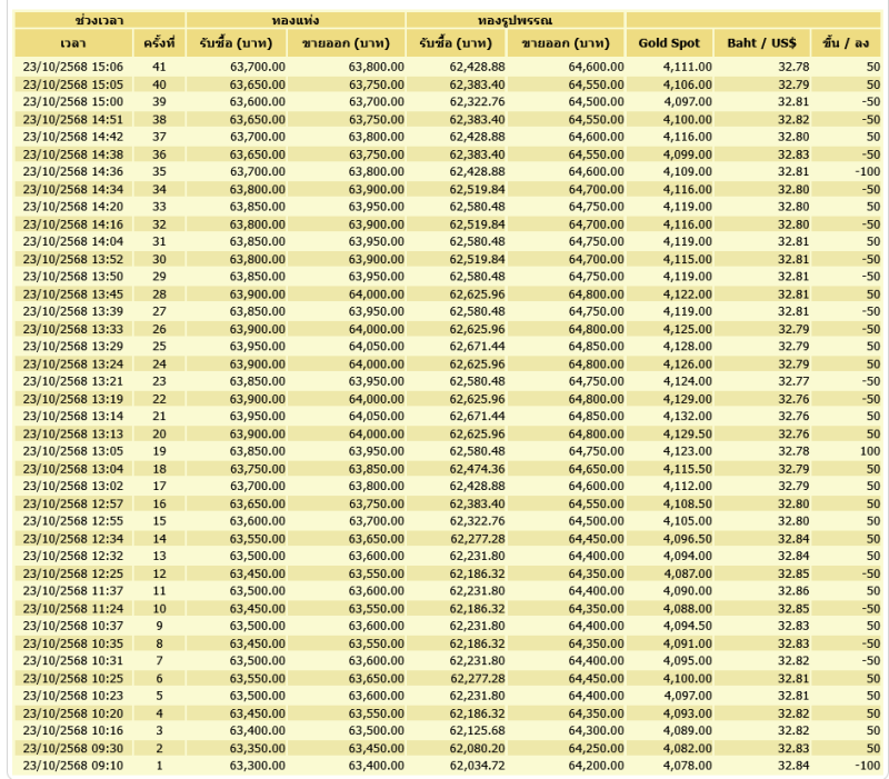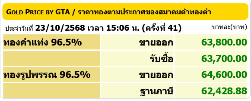 สำหรับราคาทองคำเปิดตลาดประจำวันที่ 23 ตุลาคม 2568 เปิดตลาดปรับลง 100 บาท ในครั้งที่1 ต่อมามีการปรับขึ้น-ลง รวมแล้ว 41 ครั้งแล้ว โดยทองรูปพรรณขายออกบาทละ 64,600 ตามข้อมูลจากเว็บไซต์ของ สมาคมค้าทองคำ เมื่อเวลา 15.06 น.