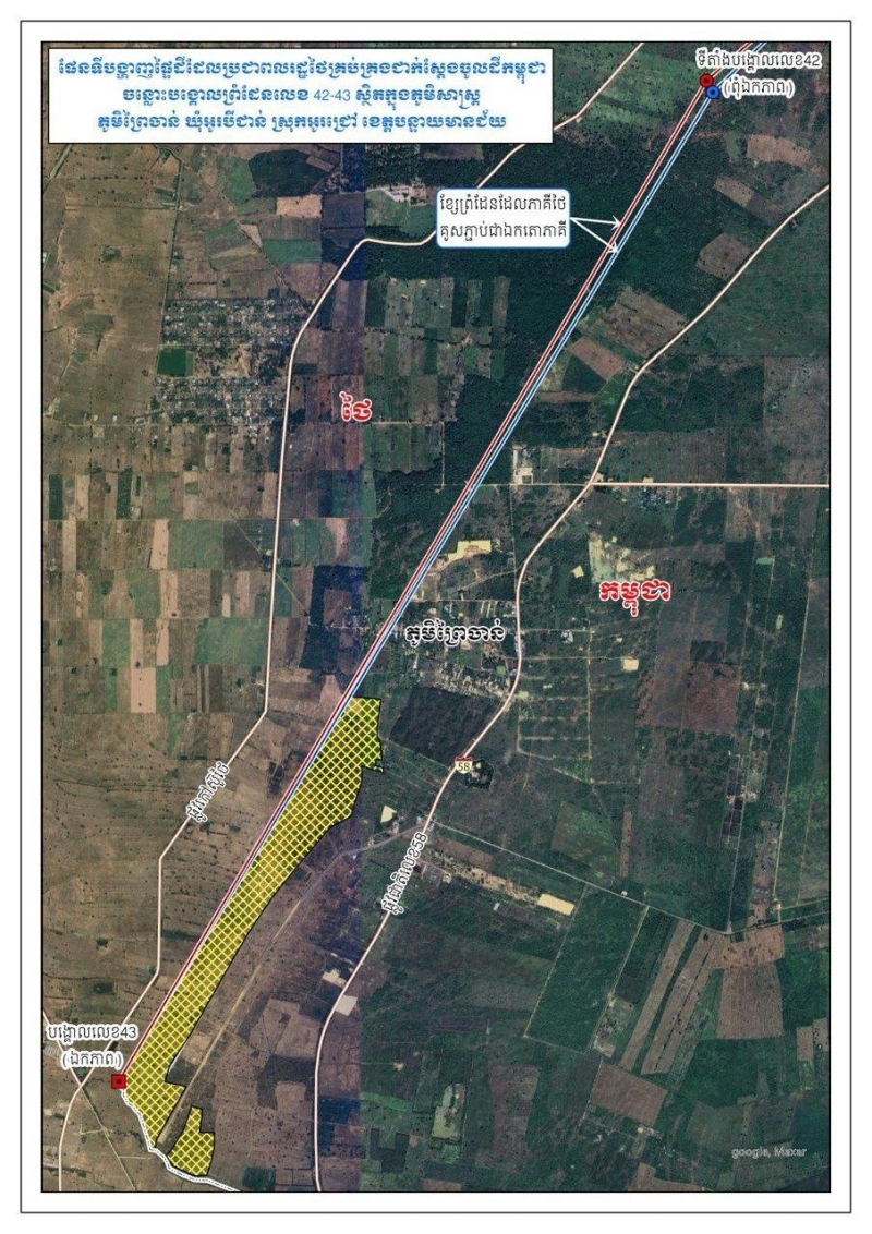 ในเรื่องนี้ กำหนดเขตแดนอยู่ภายใต้อำนาจของคณะกรรมการเขตแดนร่วมกัมพูชา-ไทย (JBC) และต้องได้รับการแก้ไขโดยสันติวิธีตามสนธิสัญญาอนุสัญญาและข้อตกลงที่มีอยู่ระหว่างสองประเทศ คือ กัมพูชาและไทย JBC ได้ทำงานร่วมกันอย่างมีประสิทธิภาพมานานกว่า 20 ปี แม้ว่าจะยังไม่เสร็จสมบูรณ์ก็ตาม