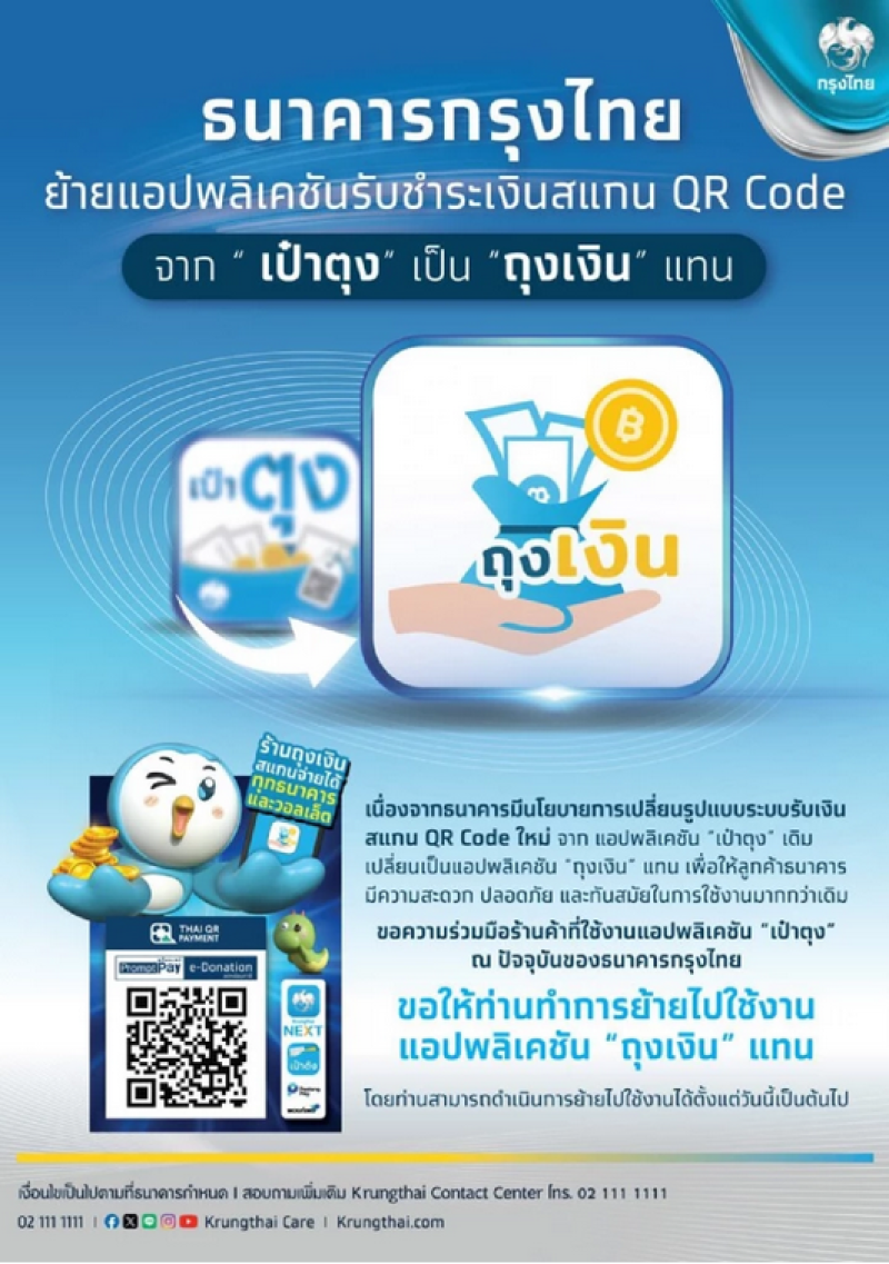 หากมีข้อสงสัย สามารถติดต่อสอบถามได้ที่สาขาธนาคารกรุงไทยใกล้บ้าน หรือโทร. 02-111-1111 ทั้งนี้ ธนาคารขออภัยในความไม่สะดวก และขอขอบคุณลูกค้าทุกท่านที่ให้การสนับสนุน เป๋าตุง ด้วยดีเสมอมา