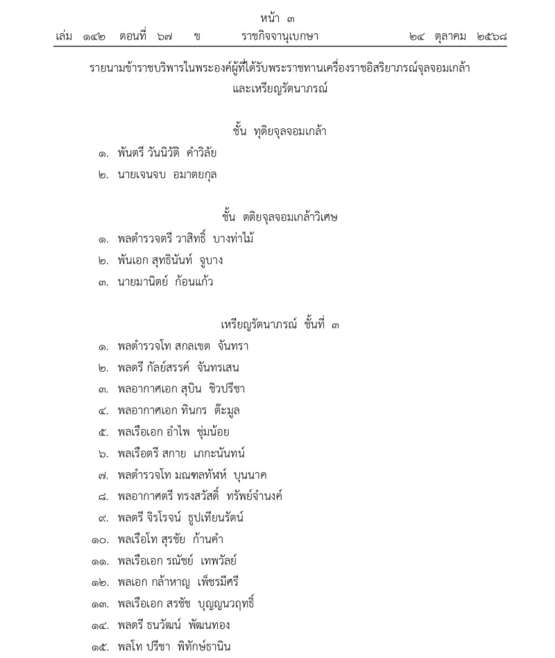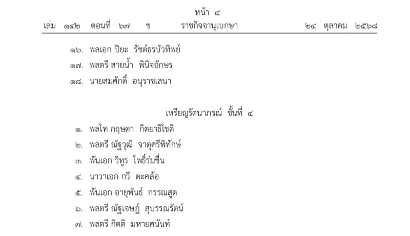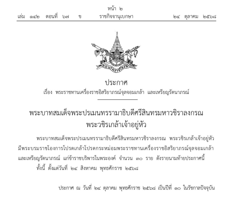 วันที่ 25 ตุลาคม 2568 เว็บไซต์ราชกิจจานุเบกษา เผยแพร่ประกาศ เรื่อง พระราชทานเครื่องราชอิสริยากรณ์จุลจอมเกล้า และเหรียฎรัตนากรณ์