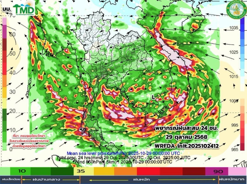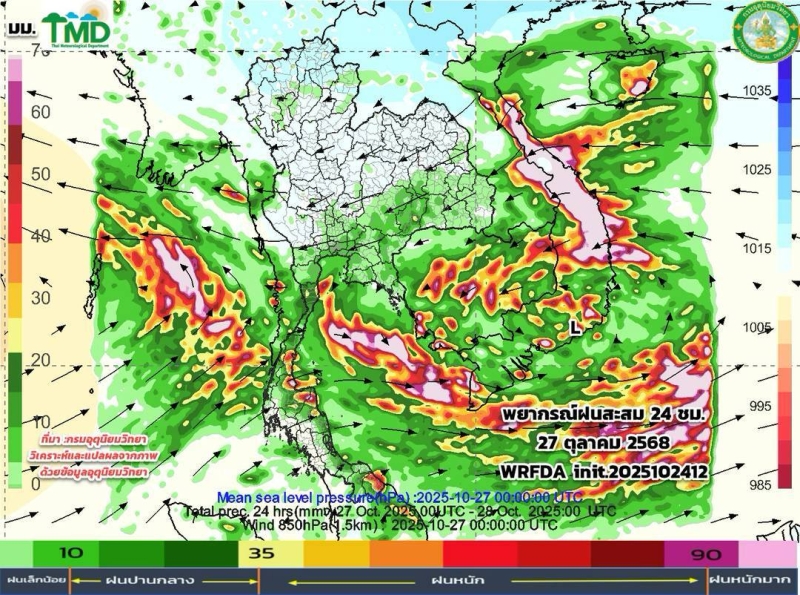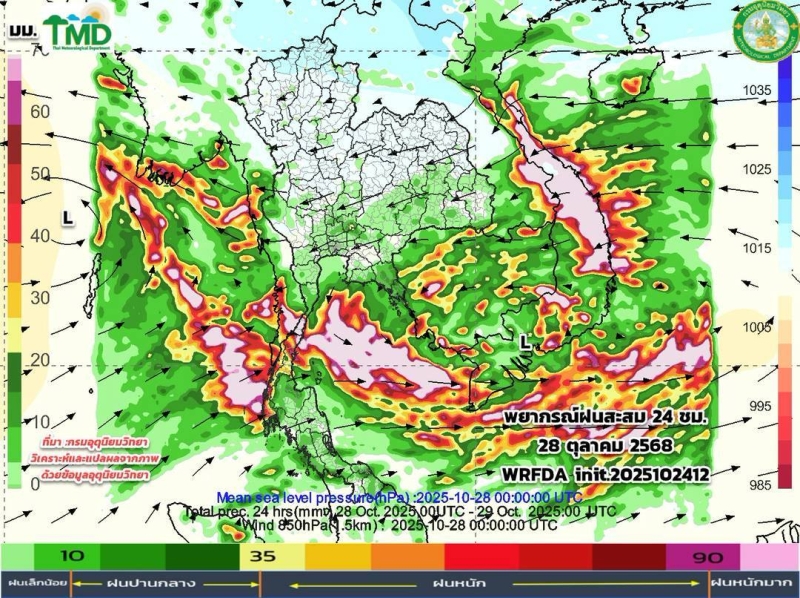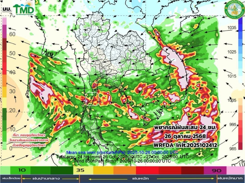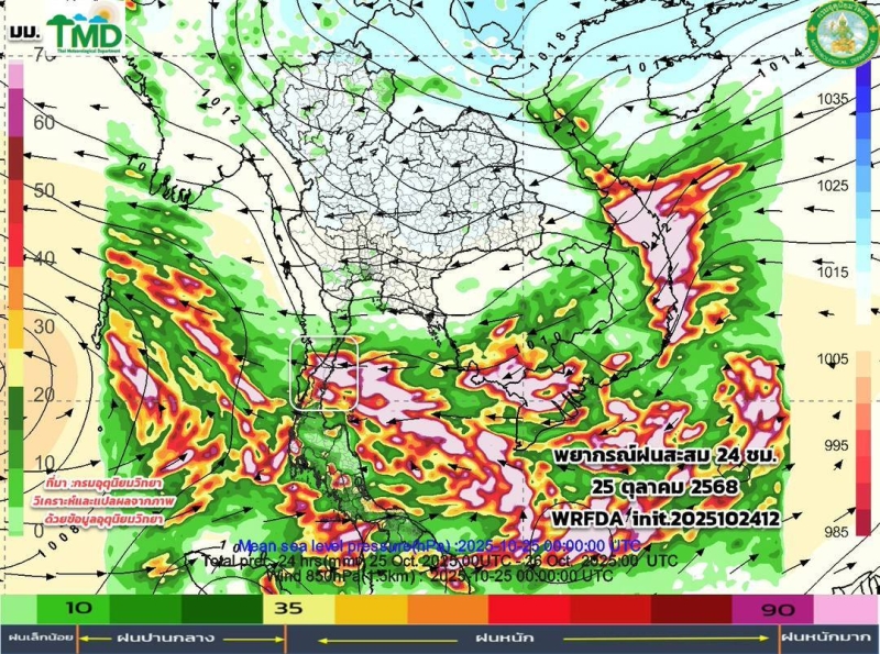วันที่ 25 ต.ค. 68 อัพเดทผลการพยากรณ์ฝนสะสมรายวัน (ทุกๆ 24 ชม.:(นับตั้งแต่ 07.00น. ถึง 07.00น.วันรุ่งขึ้น) และลมที่ระดับ 925hPa (750ม.)10 วันล่วงหน้า ระหว่าง 25 ต.ค.-3 พ.ย.68 init. 2025102412 จากแบบจำลองของกรมอุตุนิยมวิทยา (TMD-WRFDA) เฉดสีแสดงถึงปริมาณฝน (มม.) สีเขียวฝนเล็กน้อย สีแดงหมายถึงฝนหนัก (มากว่า 35.1มม.)