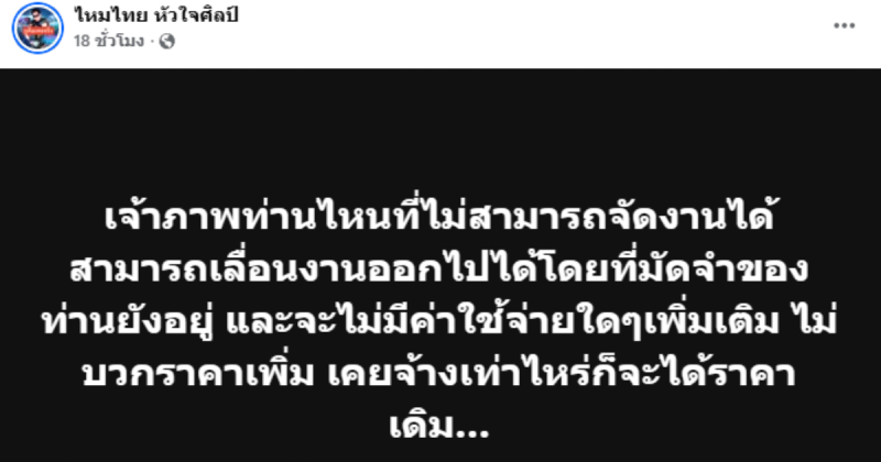 ไหมไทย หัวใจศิลป์ ใจหล่อเกินต้าน! แจ้งเจ้าภาพเลื่อนงานได้ฟรี ไม่หักมัดจำ-เล่นให้ราคาเดิมทุกงาน