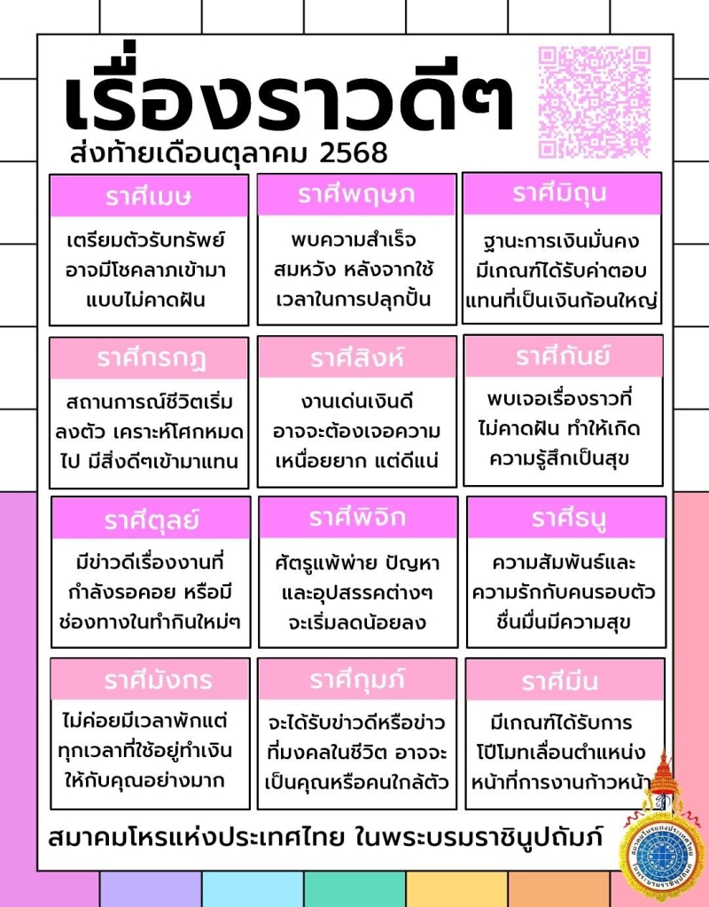 สมาคมโหรฯ เปิดดวง 12 ราศีส่งท้ายตุลาคม! ศัตรูแพ้พ่าย งานเด่นเงินดี รักสดใสแบบไม่คาดฝัน