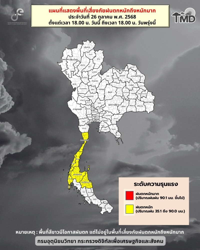 วันที่ 27 ตุลาคม 2568 กรมอุตุนิยมวิทยา พยากรณ์อากาศ 24 ชั่วโมงข้างหน้า ภาคใต้ตอนกลางถึงตอนล่างมีฝนตกหนักบางแห่ง ขอให้ประชาชนในบริเวณดังกล่าว โดยเฉพาะบริเวณจังหวัดประจวบคีรีขันธ์ ชุมพร สุราษฎร์ธานี ระนอง และพังงา ระวังอันตรายจากฝนฟ้าคะนอง ฝนตกหนักและฝนที่ตกสะสม รวมทั้งเพิ่มความระมัดระวังในการสัญจรผ่านบริเวณที่มีน้ำท่วมขัง เนื่องจากร่องมรสุมกำลังค่อนข้างแรงพาดผ่านภาคใต้ตอนกลาง
