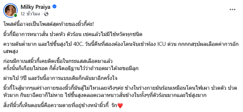 วันที่ 27 ต.ค. 2568 ทำเอาหลายคนตกใจกันเลยทีเดียว หลังมิ้วกี้ ไปรยา ได้โพสต์ผ่านเฟซบุ๊ก ชื่อ Milky Praiya โดยระบุว่า โพสต์นี้อาจะเป็นโพสต์สุดท้ายของมิ้วกี้ค่ะ! มิ้วกี้มีอาการหนาวสั่น ปวดหัว ตัวร้อน เชคแล้วไม่มีไข้หวัดทุกชนิด