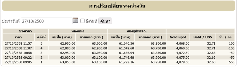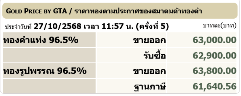 สำหรับราคาทองคำเปิดตลาดประจำวันที่ 27 ตุลาคม 2568 เปิดตลาดปรับลง 550 บาท ในครั้งที่1 ต่อมามีการปรับขึ้น-ลง รวมแล้ว 5 ครั้ง โดยทองรูปพรรณขายออกบาทละ 63,800 ตามข้อมูลจากเว็บไซต์ของ สมาคมค้าทองคำ เมื่อเวลา 11.57 น.
