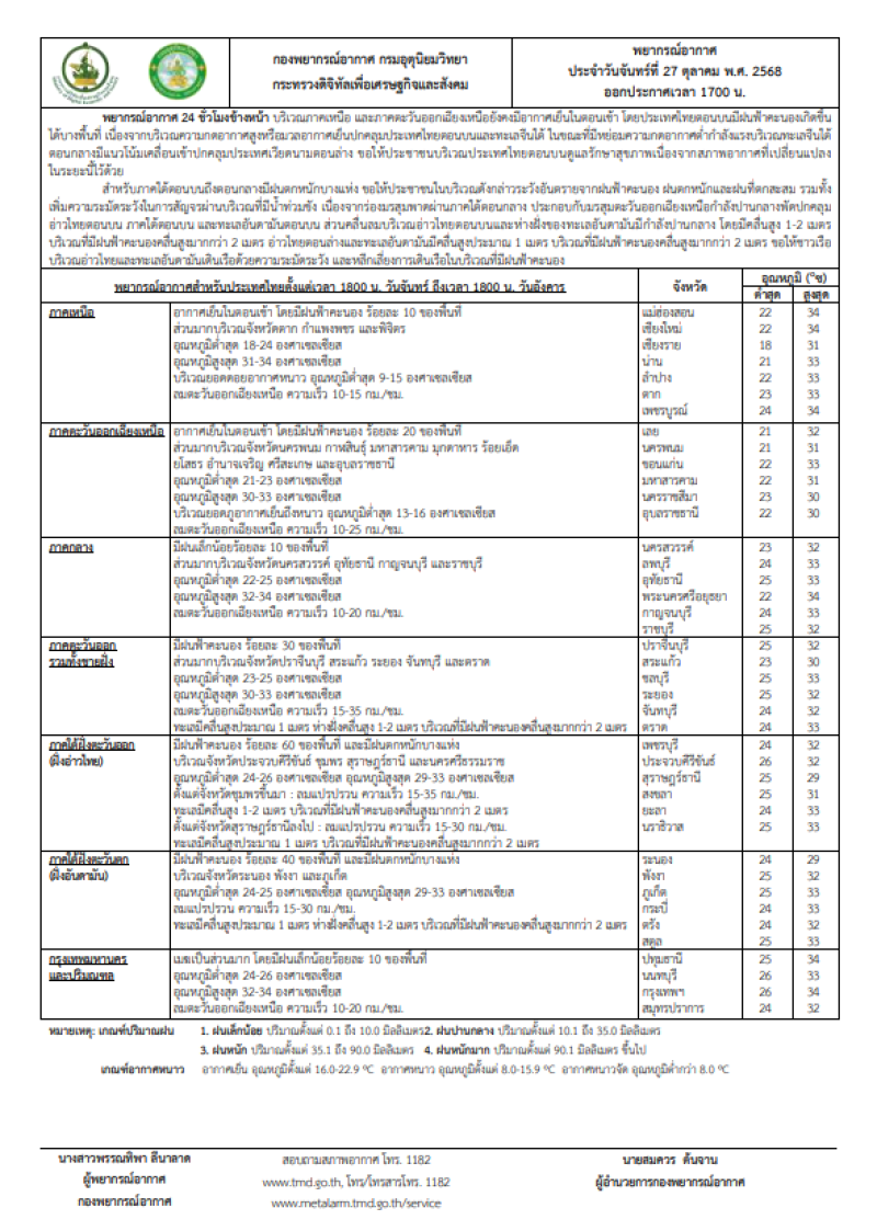 วันที่ 27 ตุลาคม 2568 กรมอุตุนิยมวิทยาได้พยากรณ์อากาศ 24 ชั่วโมงข้างหน้า บริเวณภาคเหนือ และภาคตะวันออกเฉียงเหนือยังคงมีอากาศเย็นในตอนเช้า โดยประเทศไทยตอนบนมีฝนฟ้าคะนองเกิดขึ้นได้บางพื้นที่