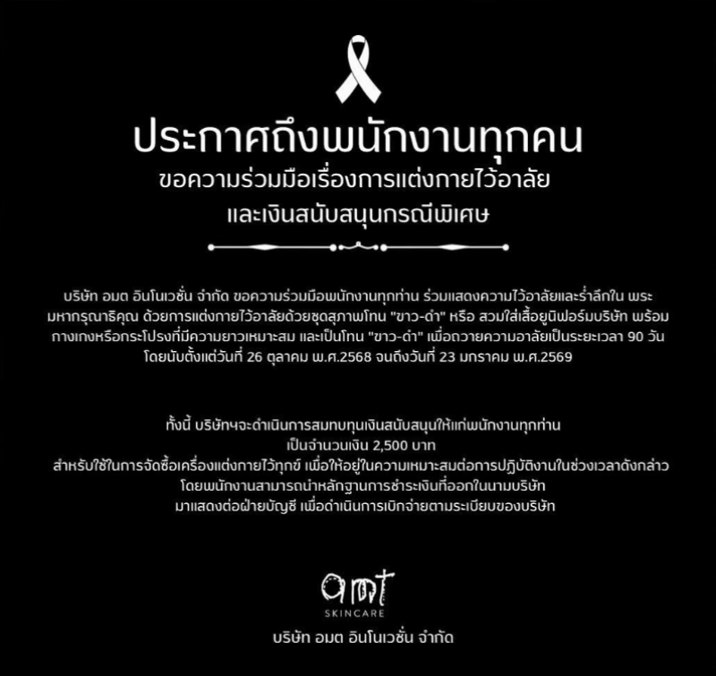 บริษัทสกินแคร์ดัง ออกประกาศ ขอความร่วมมือพนง.แต่งกายไว้อาลัย พร้อมแจกเงินให้ซื้อชุด