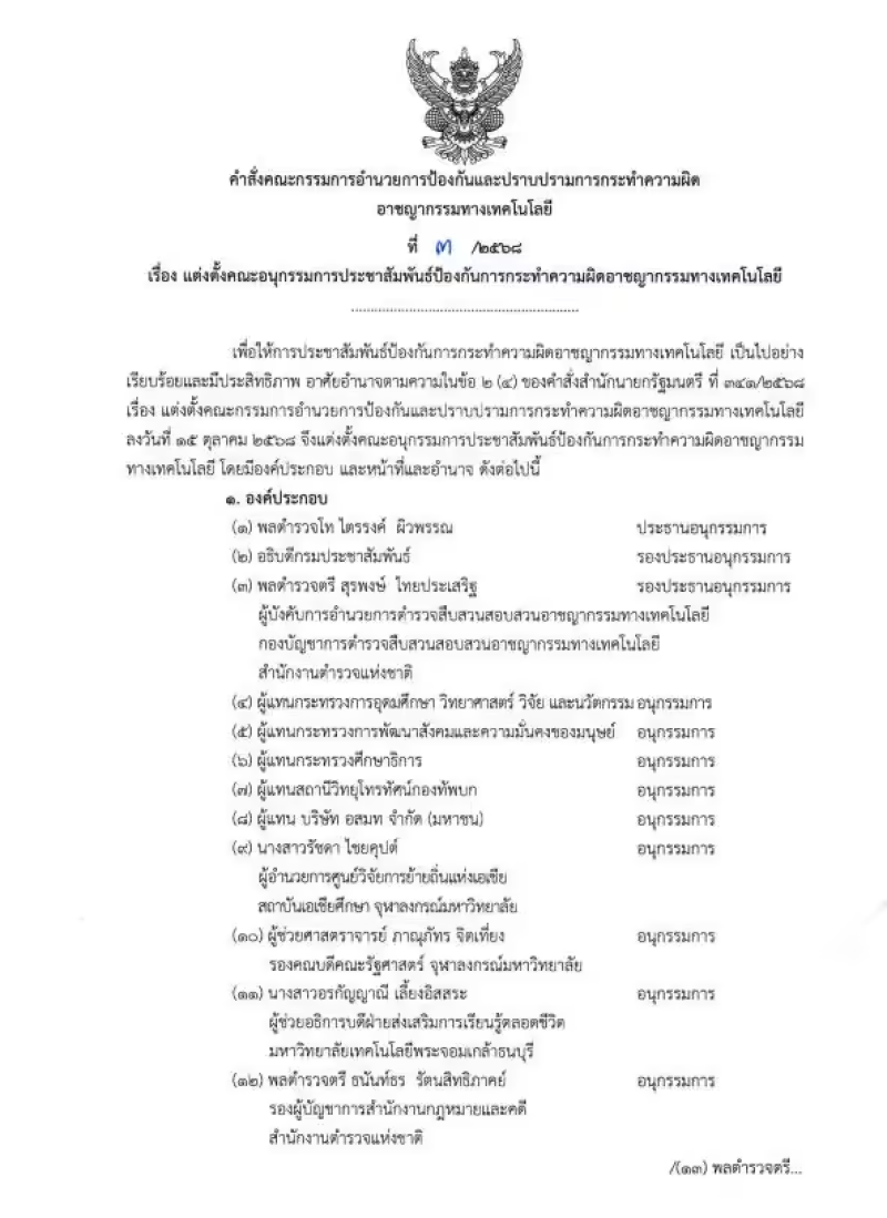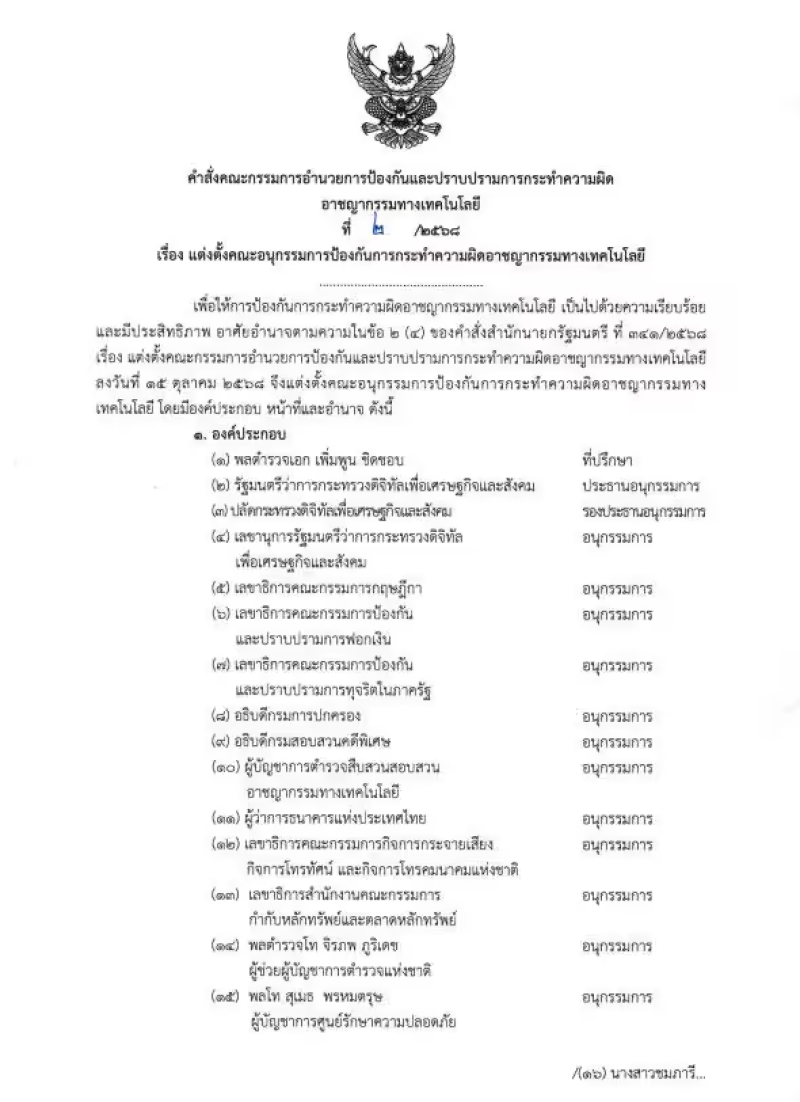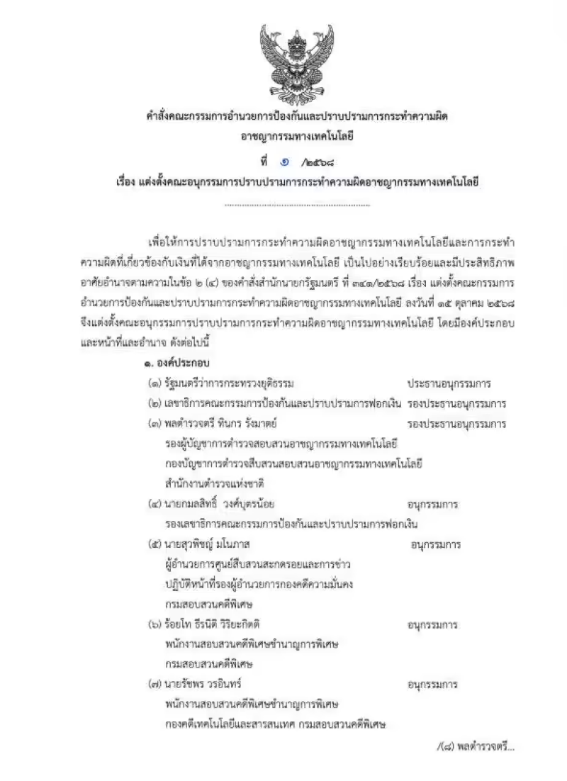 ทั้งนี้ เตรียมตั้งคณะอนุกรรมการชุดที่ 4 เพิ่มเติม โดยมี นายเอกนิติ นิติทัณฑ์ประภาศ รองนายกรัฐมนตรีและรัฐมนตรีว่าการกระทรวงการคลัง เป็นประธานฯ เพื่อดูแล เส้นเงินเทา และตรวจสอบเส้นทางการเงินที่เกี่ยวข้องกับอาชญากรรมทางเทคโนโลยี ซึ่งคาดว่านายกรัฐมนตรีจะลงนามในเร็ว ๆ นี้.