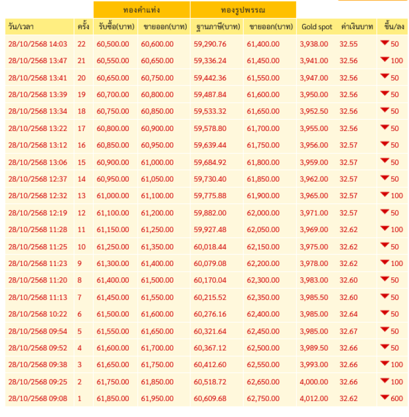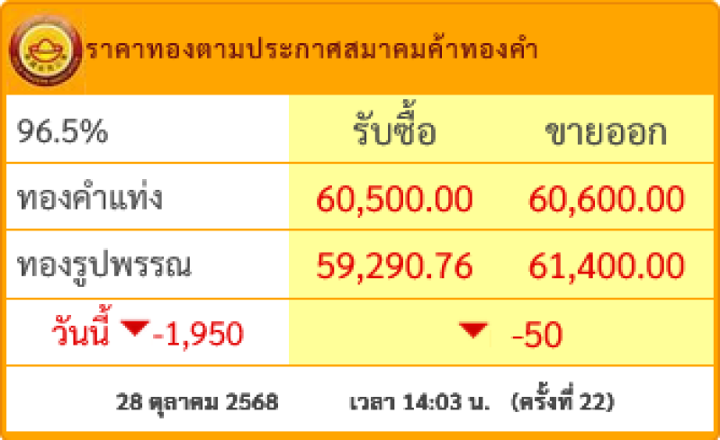 ราคาทองวันนี้ 28 ต.ค.2568 เวลา14:03 น. (ครั้งที่ 22)