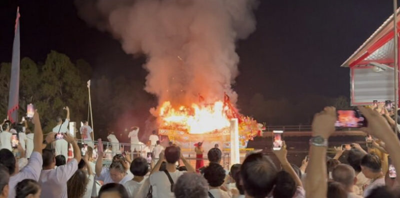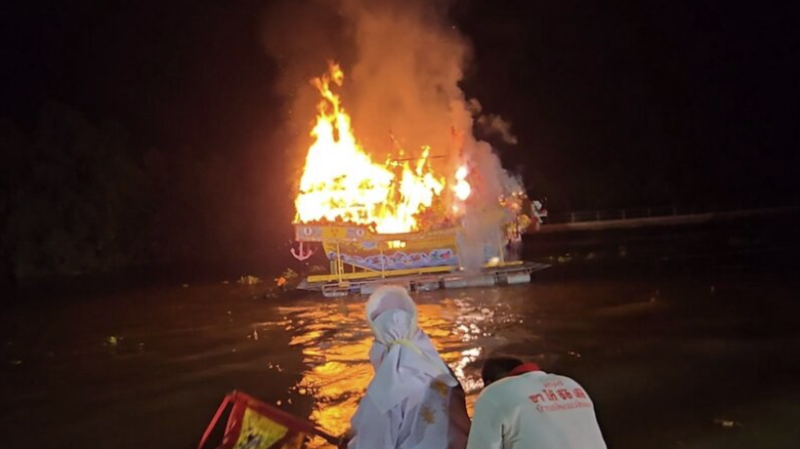 โดยเผาเรือดังกล่าวกลางคลองแม่กลองพร้อมเครื่องบูชาต่าง ๆ เช่น โคมไฟ ชุดเทพเจ้า แจกัน กระดาษเงิน กระดาษทอง และยังจุดประทัดจำนวนมาก รวมมูลค่ากว่าล้านบาท ดังสนั่นไปทั้งลำน้ำแม่กลอง