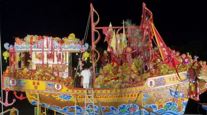 ซึ่งหลังจากสวดมนต์เสร็จได้ร่วมพิธีปล่อยเรือสำเภาที่ประทับเทพเจ้าที่ใหญ่และสวยที่สุดในประเทศไทย โดยสร้างเหมือนเรือสำเภาจริง โครงไม้ยาง และขึงด้วยผ้า และไม้อัด ตัวเรือมีขนาดกว้าง 3 เมตร ยาว 13 เมตร สูง 5 เมตร มูลค่าเกือบ 2 แสน