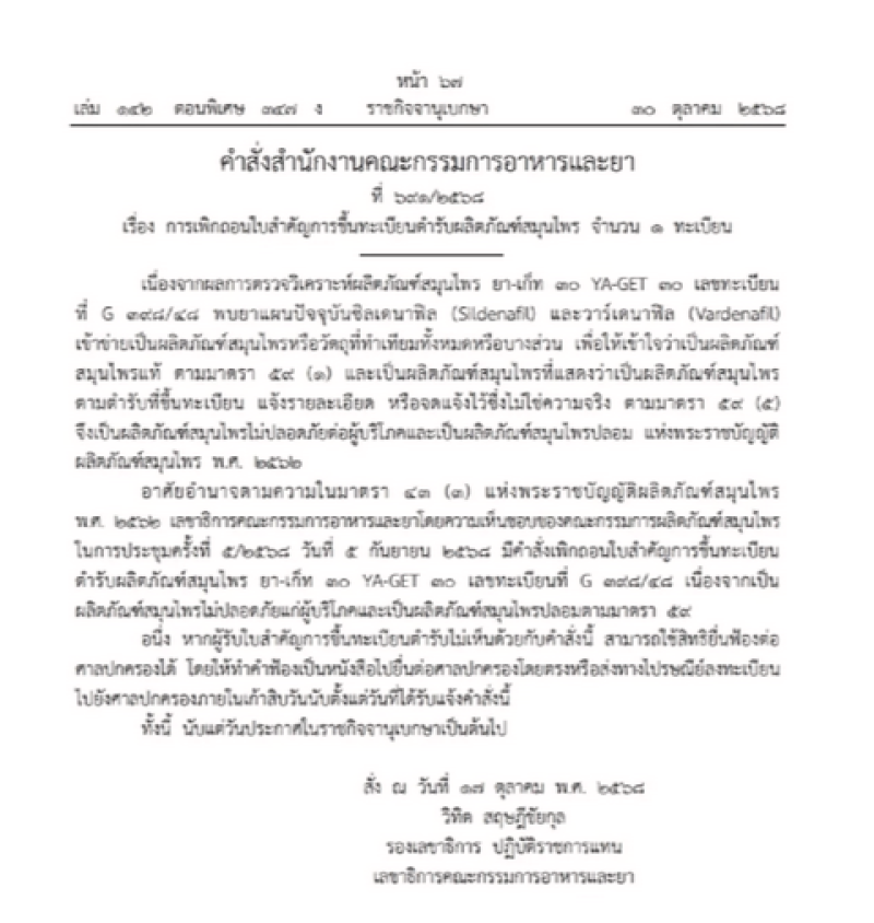 เนื่องจากผลการตรวจวิเคราะห์ผลิตภัณฑ์สมุนไพร ยา-เก็ท 30 YA-GET 30 เลขทะเบียน ที่ G 398/48 พบยาแผนปัจจุบันซิลเดนาฟิล (Sildenafl) และวาร์เดนาฟิล (Vardenafl) เข้าข่ายเป็นผลิตภัณฑ์สมุนไพรหรือวัตถุที่ทำเทียมทั้งหมดหรือบางส่วน
