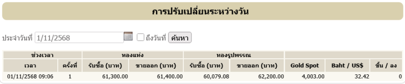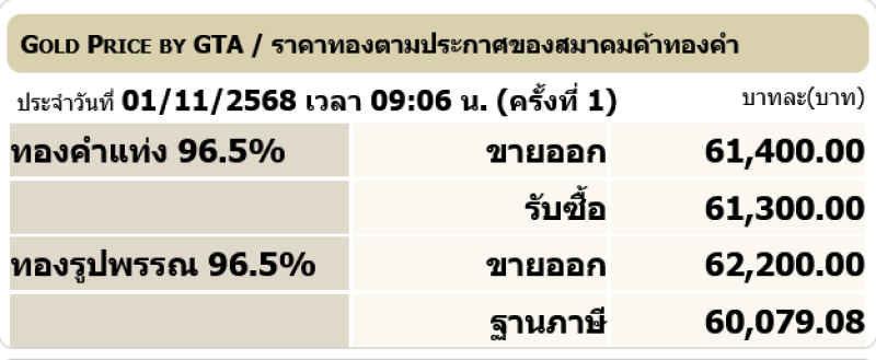 ราคาทองคำ วันที่ 1 พฤศจิกายน 2568