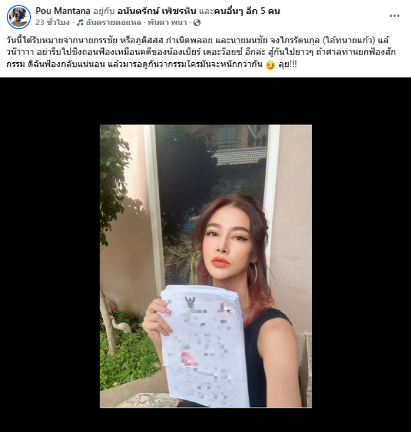 ล่าสุด เมื่อวันที่ 2 พ.ย. 2568 ที่ผ่านมา ปู มัณฑนา ได้โพสต์ภาพตัวเองคู่กับหมายศาลลงในเฟซบุ๊กส่วนตัว ชื่อ Pou Mantana พร้อมกับแท็กโพสต์ไปถึง นางสาวกฤษอนงค์ สุวรรณวงงศ์ (เจ๊พัช) และทนายธรรมราช โดยระบุว่า