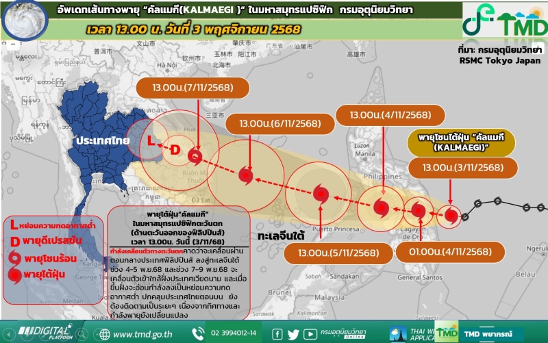 วันที่ 3 พ.ย.2568 กรมอุตุนิยมวิทยา ได้อัพเดท เส้นทางพายุคัลแมกี บ่ายวันนี้ ทวีกำลังแรงเป็นพายุไต้ฝุ่นแล้ว กำลังเคลื่อนตัวทางตะวันตก คาดว่าจะเคลื่อนผ่านตอนกลางประเทศฟิลิปปินส์ ลงสู่ทะเลจีนใต้ ช่วง 4-5 พ.ย.68 และช่วง 7-9 พ.ย.68