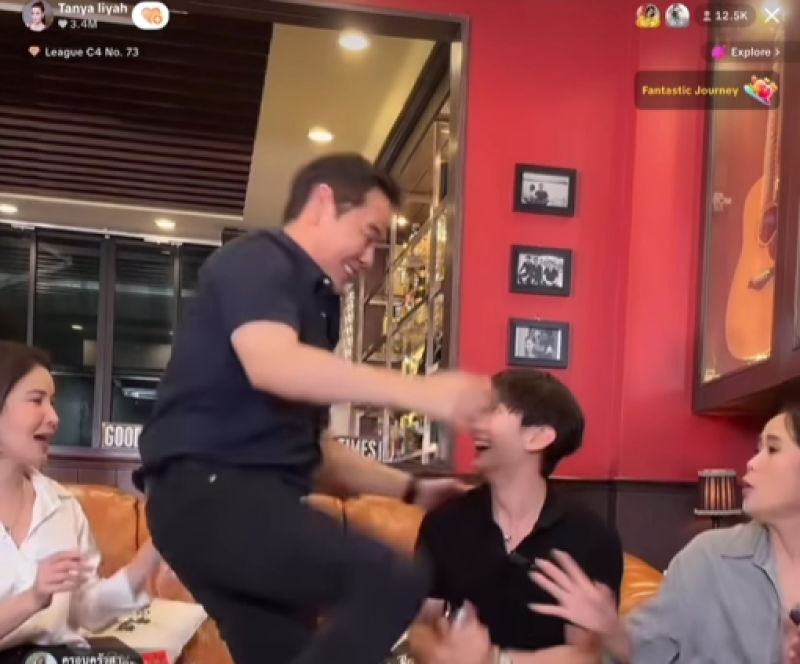 ทันทีที่พูดจบ บรรยากาศในไลฟ์ก็เปลี่ยนไปเมื่อ เป๊ก สัณณ์ชัย มีอาการออกชัดถึงกับนั่งไม่ติด ก่อนจะลุกขึ้นทำท่าทางเหมือนจะยกขาใส่น้องชายแบบขำ ๆ สร้างเสียงหัวเราะให้คนดูอย่างมาก