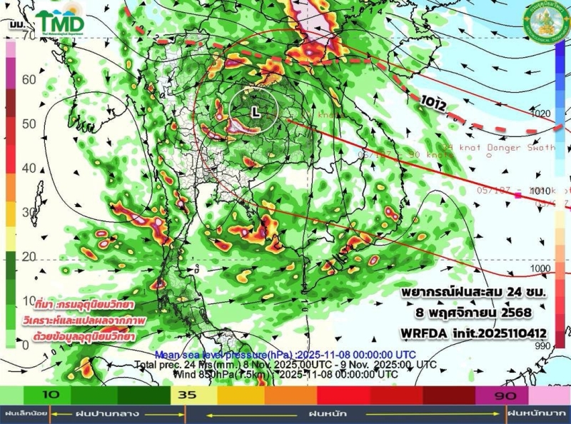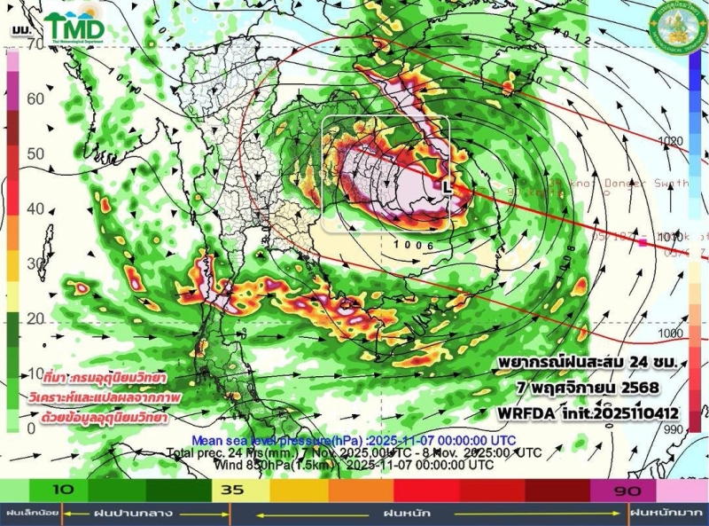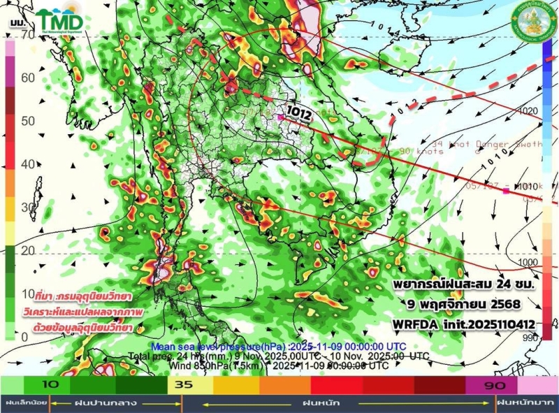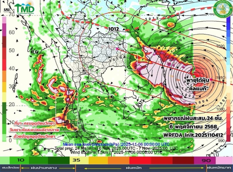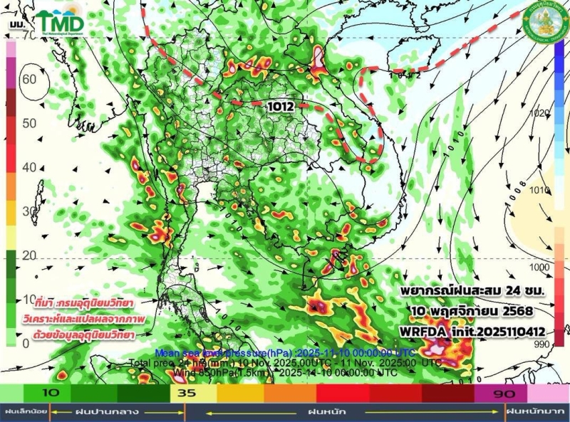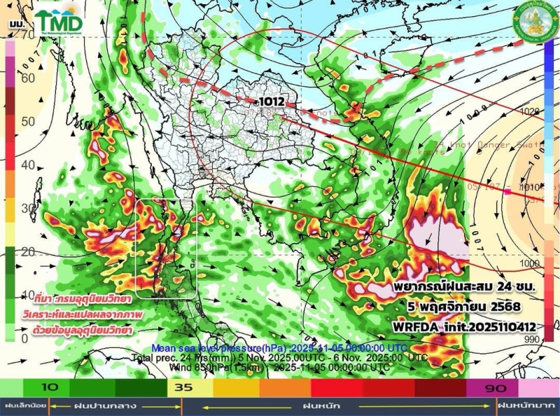 วันที่ 5 พ.ย. 68 กรมอุตุนิยมวิทยา อัพเดทการพยากรณ์ฝนและลมล่วงหน้า 10 วัน ระหว่างวันที่ 5 - 14 พ.ย. 68 จากแบบจำลอง TMD-WRFDA ของกรมอุตุนิยมวิทยา (เฉดสีบนแผนที่: สีเขียว = ฝนเล็กน้อย / สีแดง = ฝนหนักมากกว่า 35.1 มม.)
